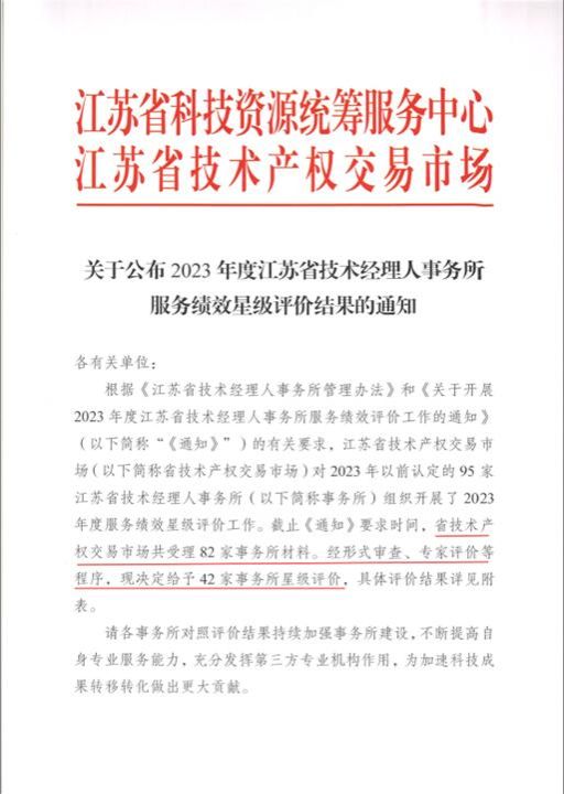 近日,江苏省资源统筹服务中心、江苏省技术产权交易市场联合发文,对全省95家省级技术经理人事务所2023年服务绩效进行评价。省技术产权交易市场共受理82家事务所绩效评价材料,经形式审查、专家评价等程序,公布2023年度绩效评价星级榜单。全省共有42家事务所进入星级榜单。贝博技术转移中心有限公司与东南大学、南京农大等8家省内高校技术经理人事务所,同列4星级榜单。