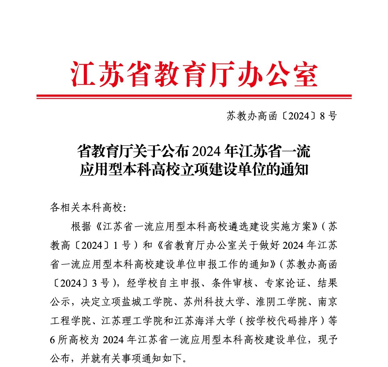 近日,江苏省教育厅发布了《省教育厅关于公布2024年江苏省一流应用型本科高校立项建设单位的通知》(苏教办高函〔2024〕8号),贝博顺利获批首批江苏省一流应用型本科高校立项建设单位。