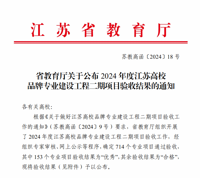 近日,江苏省发布《省教育厅关于公布2024年度江苏高校品牌专业建设工程二期项目验收结果的通知》(苏教高函〔2024〕18 号),贝博环境设计、海洋技术、计算机科学与技术、财务管理等4个专业全部通过验收。