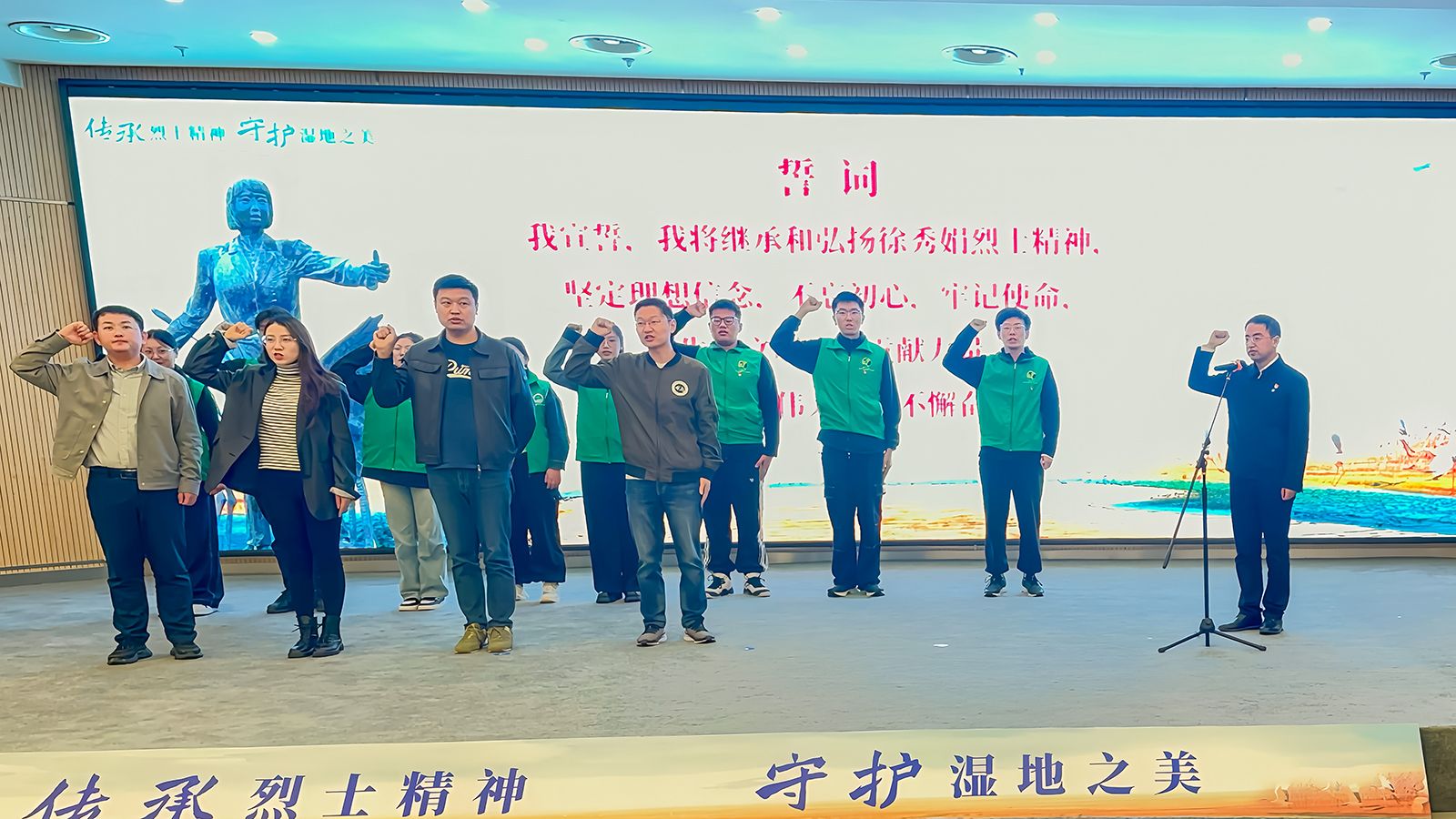 团日共建活动现场,邢晓平为bb贝博艾弗森官方网站徐秀娟黄海湿地保护志愿者协会志愿者代表授“新时代徐秀娟式志愿者团队”旗;胥爱国与相关单位代表共同发布“一个真实的故事”红色主题自然教育活动;贝博徐秀娟黄海湿地保护志愿者协会志愿者代表们集体宣誓,用铮铮誓言表达传承和弘扬徐秀娟烈士精神的坚强决心。