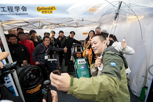 在赛车进行动态比赛之前必须经过严格的赛车技术检查,检查条款高达500余项,主要检查赛车的座舱安全、制动性能、底盘部件、车身、电池箱、整车电气安全、淋雨测试,未通过车检的车队达总数的40%。贝博赛车在设计上精益求精,在造车过程严格把控质量环节,按照大赛规则和车检要求对赛车各个系统进行反复检查。比赛期间,汽车学院副院长郑竹安到赛场指导学生电检。蔚来创始人、董事长、CEO李斌与德国马牌轮胎合肥工厂人力资源总监Alexis来贝博赛车P房,了解赛车情况并合影,大力称赞贝博的卓越工程人才培养模式、人才培养质量。