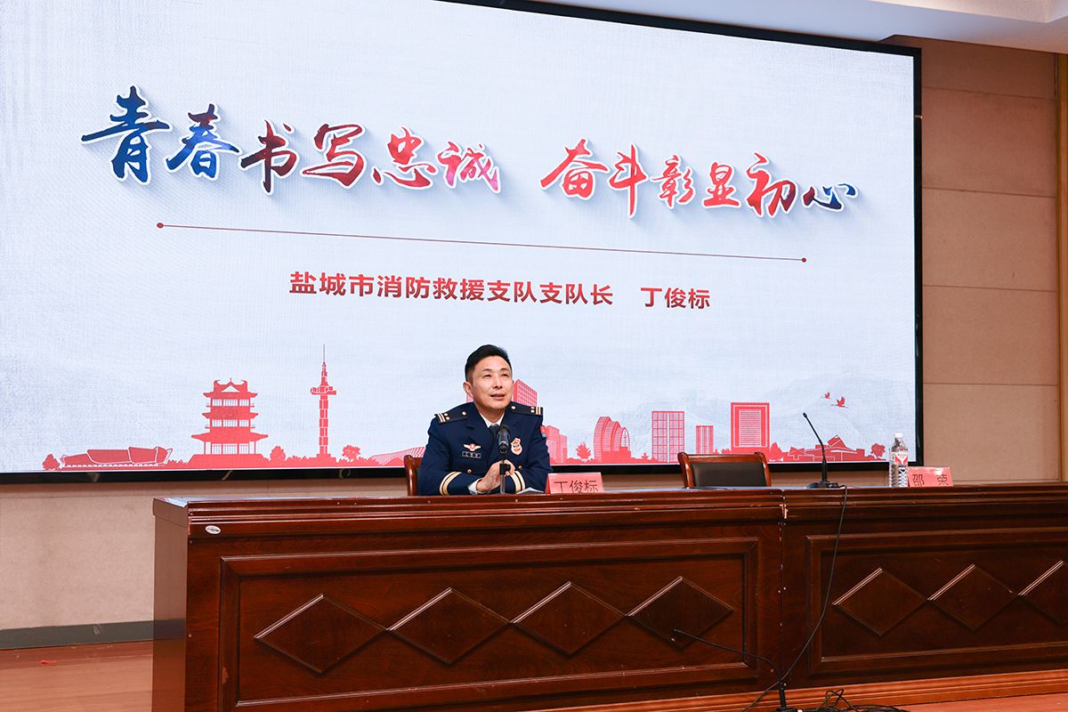 丁俊标以《青春书写忠诚 奋斗彰显初心》为题,从“火焰蓝”的青春、“消防蓝”胸怀“中国红”、“热辣滚烫”的青春三个层面,为同学们讲授了一堂涵盖消防安全、生命教育、理想信念等元素的思政课,深入浅出、生动感人。他分享了个人逐梦和消防救援经历,将爱国主义教育融入消防官兵背后的故事,用生动的语言讲述了最美逆行者牢记使命、践行初心、铭刻誓言,用忠诚脊梁扛起守护人民生命财产安全的感人事迹。他谈到,消防安全是生命之本,生命安全是青春之基,青年学生应当敬畏生命、珍惜生命,以实际行动当好校园安全的青春守护人。