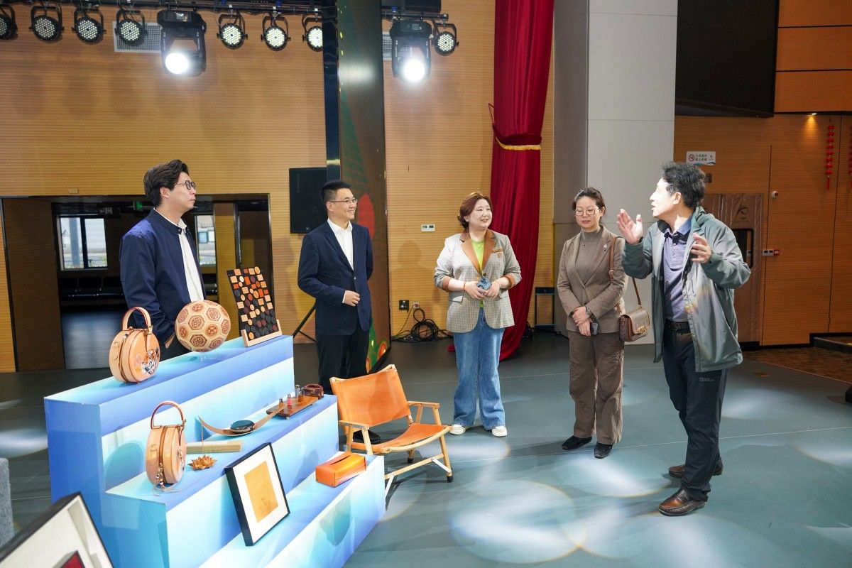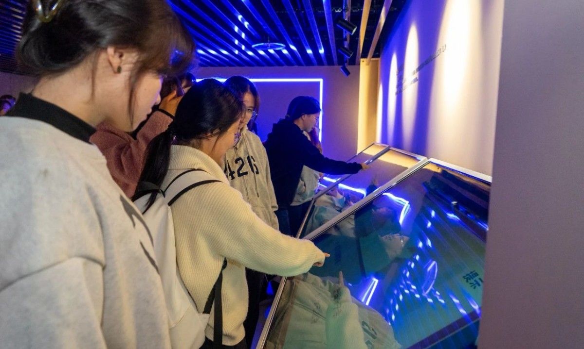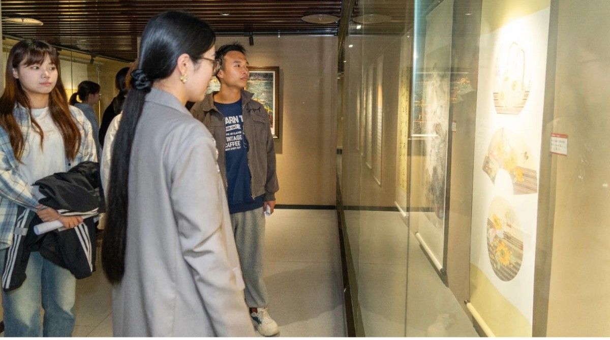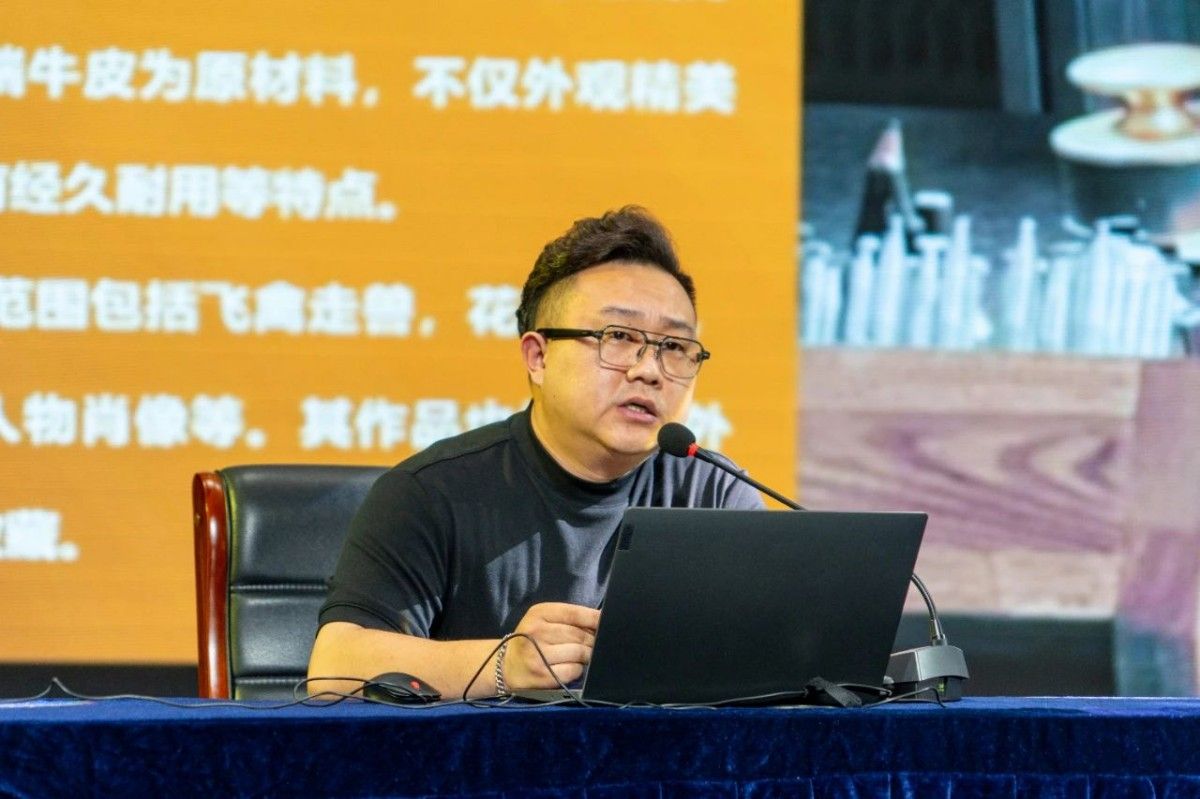 活动期间,师生们聆听了盐南皮雕技艺传承人、珠溪皮坊主理人张华的非遗美学导赏课。师生们一同走近“指尖上的非遗——皮雕”,感受皮雕的生活之美。在这里,牛皮不再是普通的材料,而是匠人们眼中的“纸张”,以其为画布,以刀为笔,巧妙地勾勒出一幅幅生动的图案。牛皮上的每一刀每一划,都凝聚着匠人的心血与智慧,仿佛能讲述一段段古老而动人的故事。现场师生被精湛的技艺深深吸引,与张华老师面对面交流,感受皮雕艺术的魅力所在。最后,师生们还参观了《翰墨颂辉煌·丹青绘巨变——庆祝中华人民共和国成立75周年全省文化馆(群文)美术书法作品大展》和数字文化展厅。