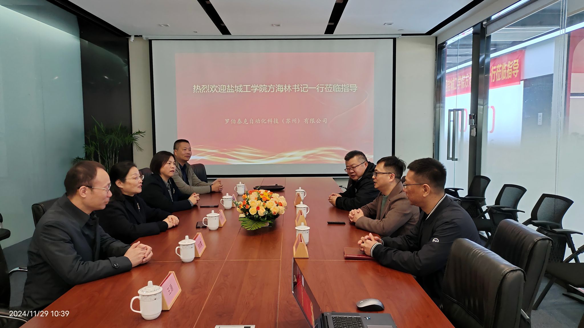 为深入贯彻党的二十届三中全会精神,落实党中央、国务院关于促进高质量充分就业决策部署,进一步深化校企合作,拓宽毕业生就业渠道,11月29日,校党委书记方海林,党委常委、副校长、组织部部长邢晓平带队到校友企业罗伯泰克自动化科技(苏州)有限公司开展访企拓岗促就业专项行动,做实做细就业指导服务,加快推进毕业生就业工作进程。罗伯泰克自动化科技(苏州)有限公司副总经理邓俊挺、厉明福,工程师赵成明,校招生与就业创业指导处、人事处、信息工程学院等负责同志陪同调研。