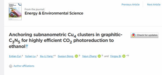近日,贝博江苏省新型环保重点实验室崔恩田博士为第一作者、以bb贝博艾弗森官方网站为第一单位的研究论文“Anchoring subnanometric Cu4 clusters in graphitic-C3N5 for highly efficient CO2 photoreduction to ethanol. ”在顶级期刊Energy & Environmental Science上发表。该学术期刊是英国皇家化学会的旗舰期刊、公认的能源与环境科学领域顶尖刊物,影响因子32.5。