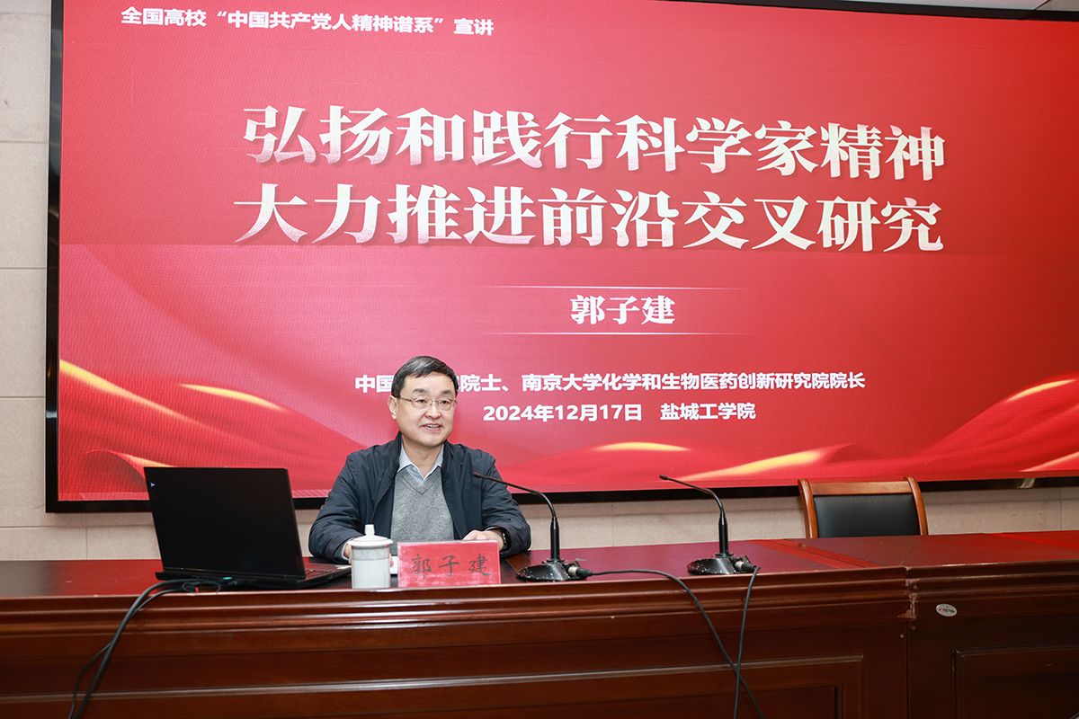 12月17日下午,在希望大道校区机械馆报告厅,全国高校“中国共产党人精神谱系”宣讲团专家、中国科学院院士、南京大学郭子建教授应邀来校作题为“弘扬和践行科学家精神,大力推进前沿交叉学科建设”专题报告。校党委副书记薛浩主持,党委常委、宣传部部长奚新国,相关职能部门主要负责人,各二级学院党政主要负责人,具有博士学位、副高以上职称教师代表等300余人参加。