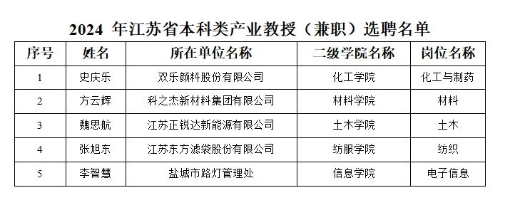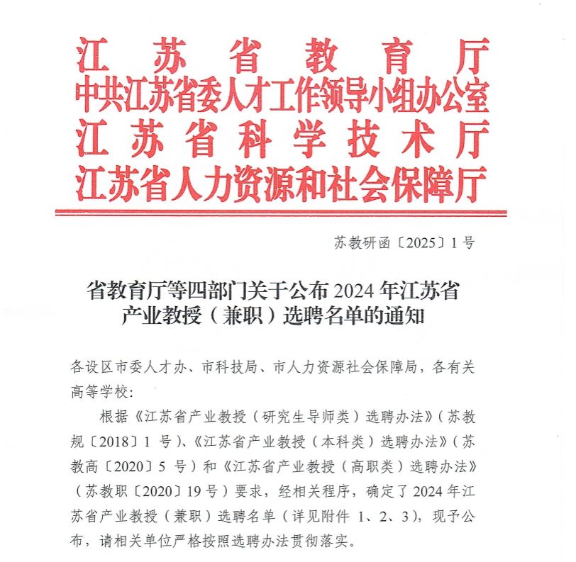近日,省教育厅、省委人才办、省科技厅、省人力资源和社会保障厅联合发布《省教育厅等四部门关于公布2024年江苏省产业教授(兼职)选聘名单的通知》(苏教研函〔2025〕1号),本年度全省共选聘196名本科类产业教授,贝博推荐的候选人有5名成功获批。目前,贝博本科类产业教授(兼职)已达20名。