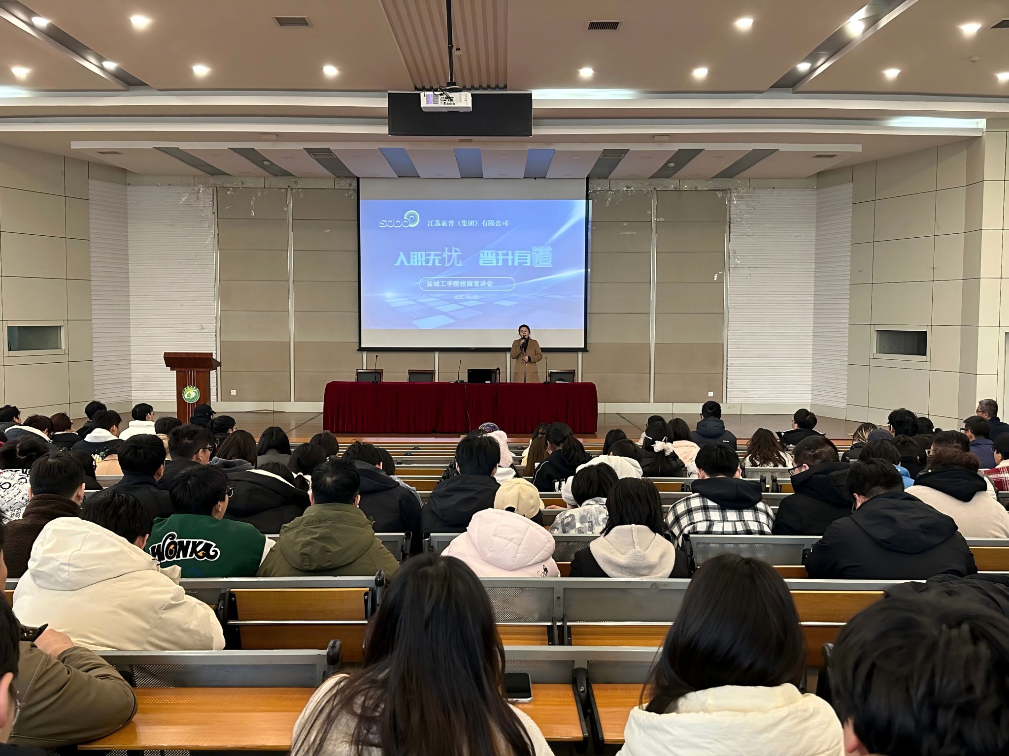 会后,范立明一行参观了学校产教融合成果展,并在建军东路校区化工楼报告厅举办索普集团2025届春招宣讲会。50余名毕业生现场投递简历,与人力资源负责人进行沟通交流,现场气氛热烈。