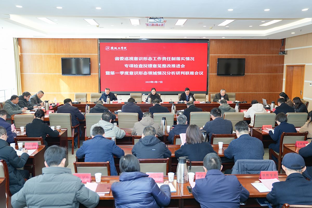 3月17日上午,学校在希望大道校区行政楼9楼视频会议室,召开省委巡视意识形态工作责任制落实情况专项检查反馈意见整改推进会暨第一季度意识形态领域情况分析研判联席会议。党委书记方海林出席并讲话。党委副书记薛浩主持。党委常委、统战部部长姚军,党委常委、宣传部部长奚新国,意识形态重点领域相关单位负责人,各二级党组织负责人,机关各党支部书记参加会议。