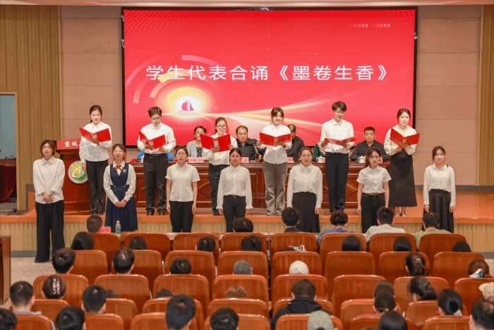 启动仪式上,丁成等为2024年度阅读之星代表、读者协会优秀会员及优秀部门代表颁发荣誉证书。学生处处长杨汉华号召师生读者养成“爱读书、读好书、善读书”的良好习惯。图书馆馆长李明宣读bb贝博艾弗森官方网站2025年度校园阅读推广系列活动通知,就活动安排主题、活动形式、品牌特色等进行了介绍。学生代表分角色合诵《墨卷生香》,通过《诗经》《楚辞》《理想国》等中西经典文本的声韵交织,以墨香为舟、文字为桨,演绎千年文明的精神图谱。