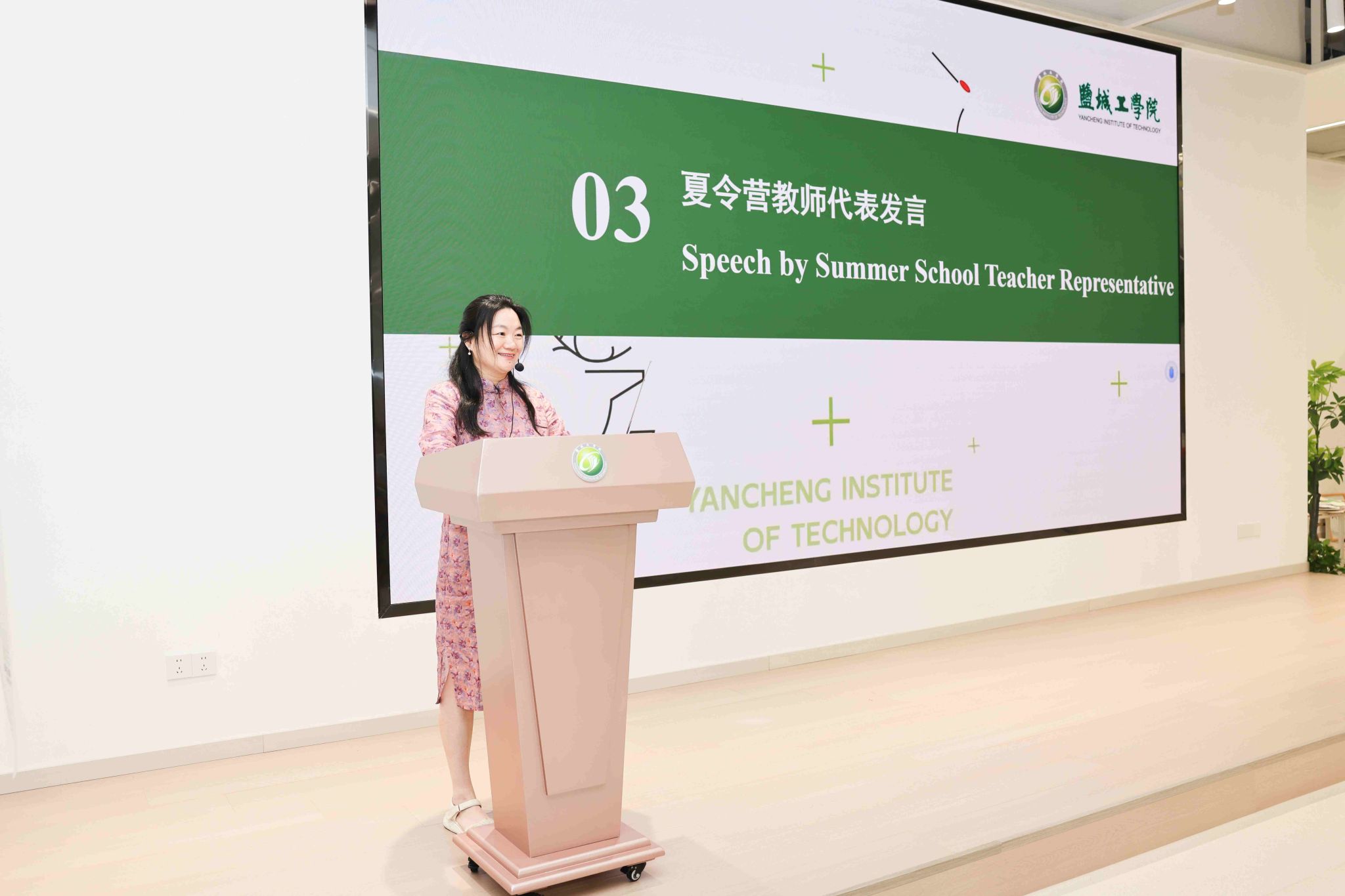 外国语学院周亚萍作为教师代表发言.她引用“美美与共”的理念,强调文化交流与融合的重要性,并希望学员们将“盐工记忆”带向世界。