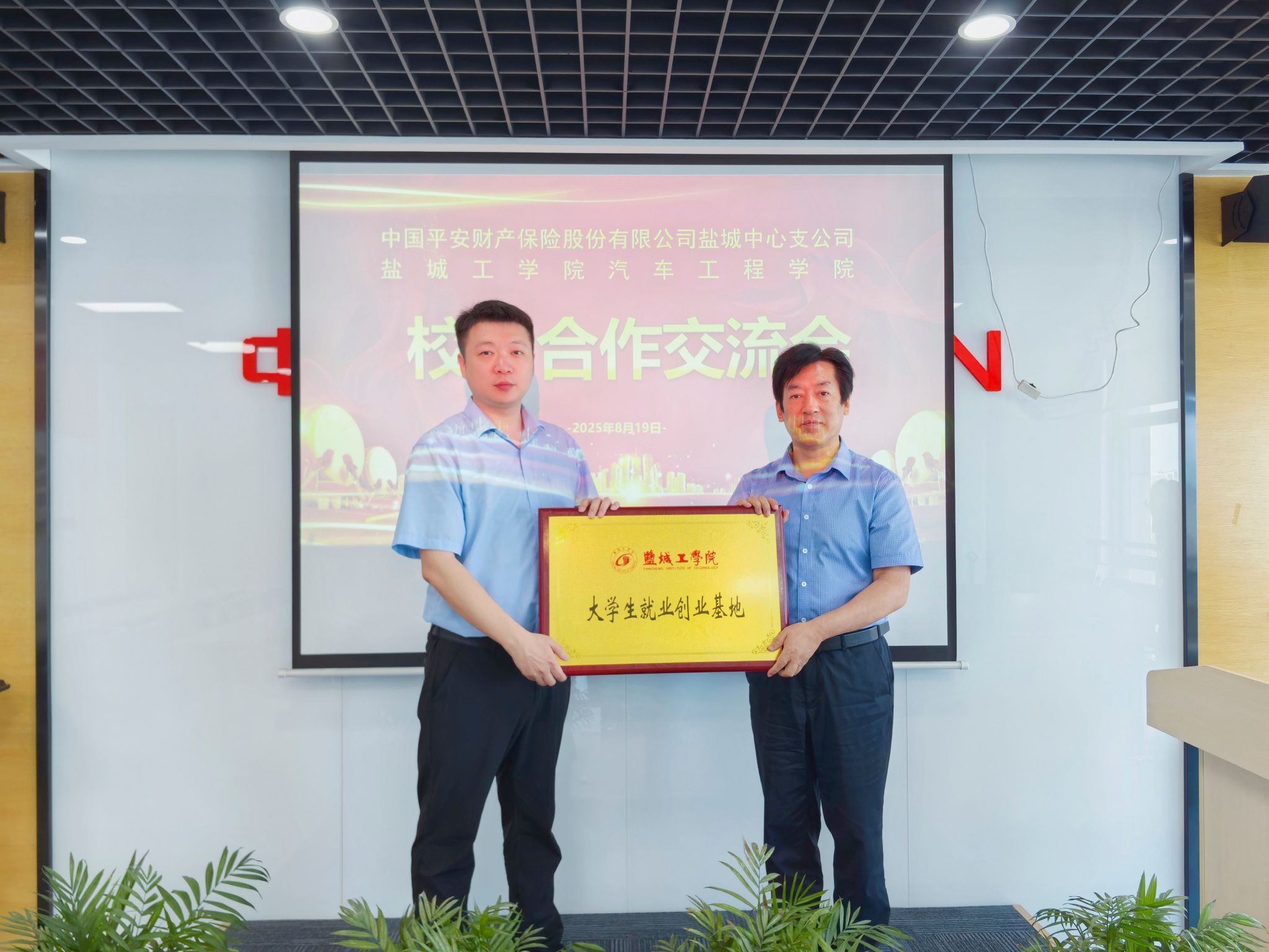 在校企合作交流会上,王资生介绍了bb贝博艾弗森官方网站的办学历程、办学特色、学科优势、当前学校发展重点任务以及汽车工程学院人才培养成效。中国平安盐城中心支公司总经理傅博介绍了中国平安财险公司的发展历程、核心业务以及在盐城的战略布局,表达了企业对高素质应用型人才的迫切需求。双方围绕“行业人才需求精准对接、产教融合模式创新、学生实习就业渠道拓展”等核心议题展开务实讨论并形成共识。会上,双方举行了大学生就业创业实践基地授牌仪式,标志着双方合作进入更深层次、更加广泛的实质性阶段,将为bb贝博艾弗森官方网站学生提供更多实习实训及就业机会,有力促进教育链、人才链与产业链的紧密衔接。