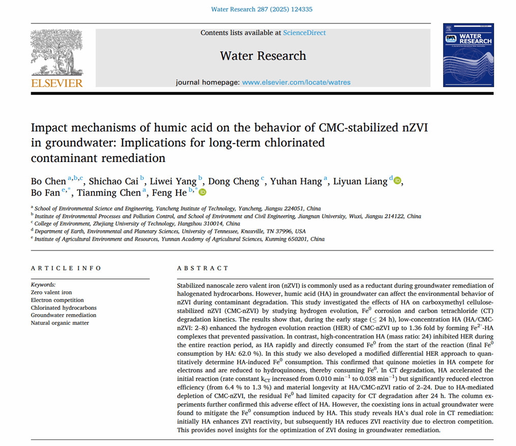 近日,贝博环境学院水环境与污染控制研究所陈勃博士在国际环境领域的顶级期刊Water Research上发表题为“Impact mechanisms of humic acid on the behavior of CMC-stabilized nZVI in groundwater: Implications for long-term chlorinated contaminant remediation”的研究成果(Water Research 287 (2025) 124335)。陈勃博士为论文第一作者,江南大学何锋教授为通讯作者。这是贝博首次以第一单位在Water Research发表研究论文。Water Research创刊于1967年,是环境科学与生态学领域最具权威性和影响力的顶级学术期刊之一。期刊长期致力于发表具有原创性、突破性和前瞻性的环境科学与技术研究成果,以其严谨的学术标准、卓越的论文质量和广泛的国际影响力享誉全球。根据最新发布的期刊引证报告(JCR),Water Research在2024-2025年度的影响因子达到12.4,持续位列环境科学领域Q1区期刊前列。