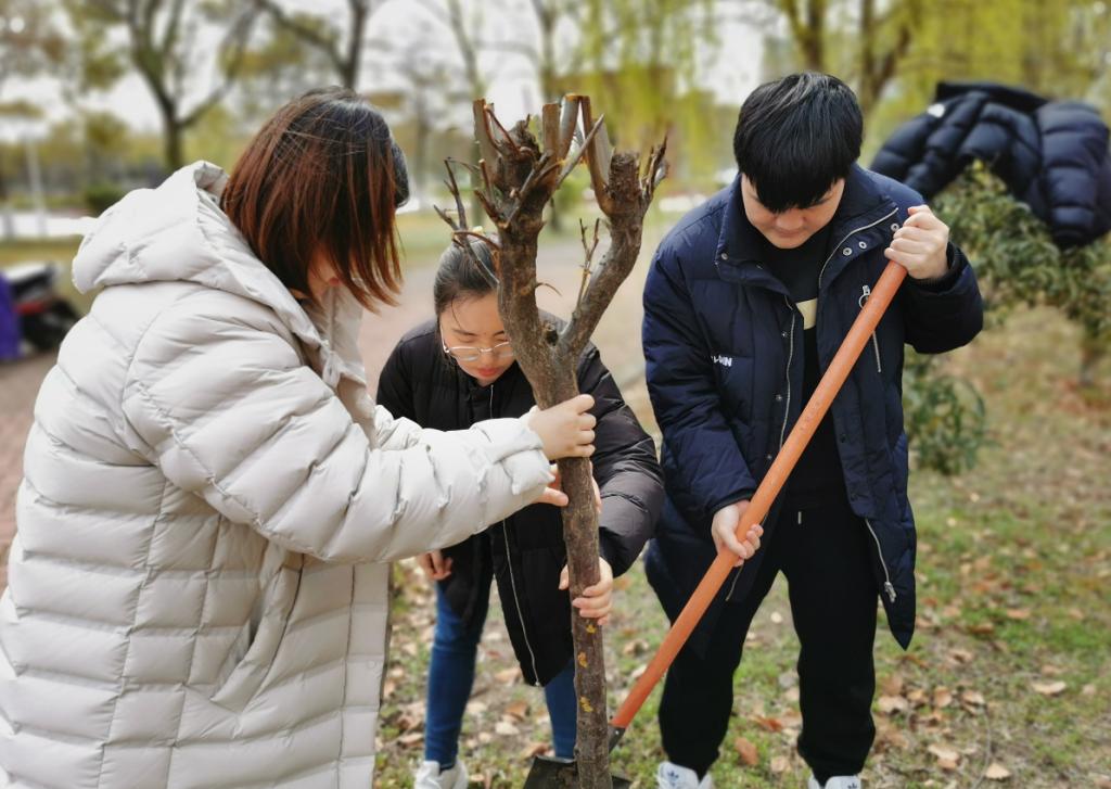 活动中,后勤服务集团对植树场地安排、树苗种类等方面给予了专业指导意见,并提供了铁铲、水桶等植树工具。设计艺术学院师生在后勤服务集团工作人员的指导下展开劳动,大家分工明确,相互配合,有的松土挖坑,有的放苗培土,有的踩土浇水,活动现场气氛热烈。各班级还为本班种植的树苗设计并制作了各具特色的标识牌,同学们纷纷在栽种好的树苗前合影留念。活动结束后,同学们说:“本以为植树是件简单的事,今天亲自动手才发现是件技术活,不仅需要细心和耐心,还有技巧。”“我们希望在大一种下一棵树,陪伴和见证我们四年学习成长,这是一件格外有意义的事。”“一班一棵树,人人一片林,希望这样的活动长久坚持下去,我们共同建设绿色校园。”