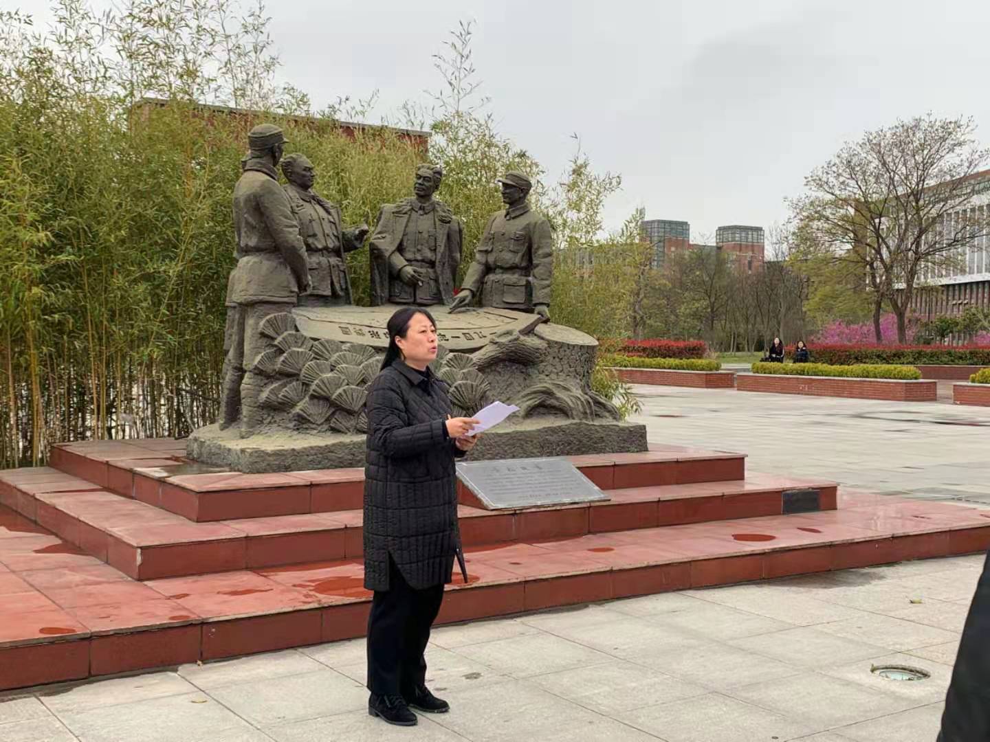 3月31日下午,设计艺术学院党总支在南校区铁军广场开展“深入学习党史、传承红色基因、凝聚奋进力量”主题党日活动,学院党总支书记胡凌霞主持,学院中心组成员、全体教工党员和学生党员等60余人参加活动。