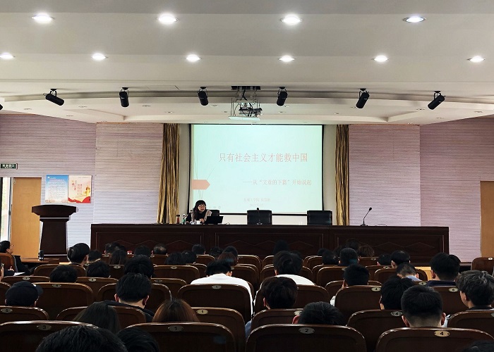 侯慧艳以“只有社会主义才能救中国——从‘文章的下篇’开始说起”为题,围绕“初建的新中国:一穷二白、危机四伏”、“在自力更生的基础上加速完成工业化”、“‘一体两翼’过渡时期总路线的提出”、“三大社会主义改造推进的历史过程”、“三大改造的伟大胜利以及遗留的问题”等方面,引用大量的历史事实生动详实地讲述了只有社会主义才能救中国,救中国人民于水火、谋幸福、谋复兴的党史。她指出,社会主义不但在上世纪中叶救中华民族于危急,而且将在新世纪,继续为中华民族带来新的生机。因此,我们必须要珍视这七十年来社会主义的发展经验,珍视这历经几代人千辛万苦形成的中国特色社会主义道路。最后,侯慧艳希望广大教师和学生一定要加强党史学习,在学思践悟中坚定理想信念,在奋发有为中践行初心使命。