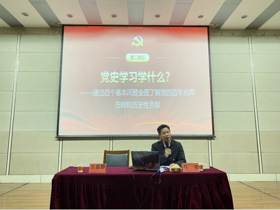 马荣以“学党史,强信念,奋力开启全面建设社会主义现代化国家新征程”为主题,围绕“为什么要学党史?”、“党史学习学什么?”等五个问题,全面讲解了我们党百年奋斗历程的历史脉络、学习重点、学习方法,系统阐释了开展党史学习教育的主要内容,必须深刻把握的重点以及在全党开展党史学习教育的重大意义。新中国来之不易,中国特色社会主义来之不易,马荣鼓励同学们多关注身边的党史文化,增强文化自信,在学习和生活中也要善于总结经验,提高能力水平,发扬革命精神,保持昂扬姿态。