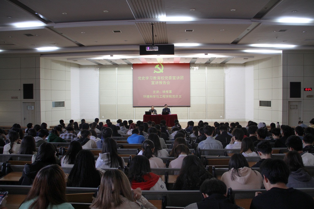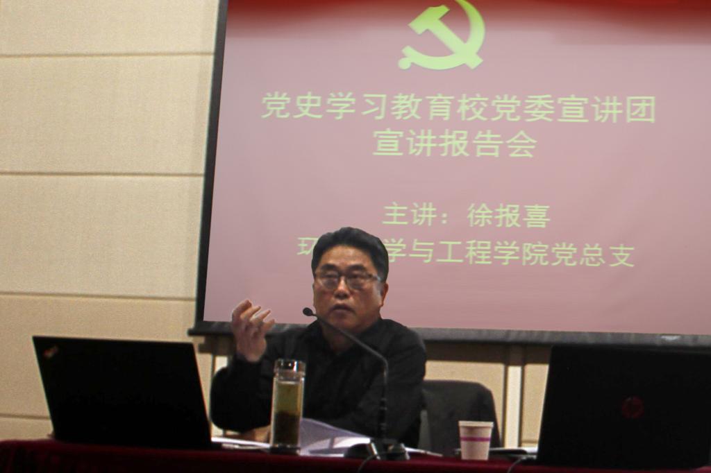 4月21日下午,在北校区化工楼报告厅,党史学习教育校党委宣讲团成员、校关工委副主任徐报喜为环境学院师生作题为“学习百年党史,做信念坚定的继承人”首场宣讲。学院党总支副书记周政主持,学院辅导员、学生党员、入党积极分子、学社干部、19级、20级学生代表等400余人参加。