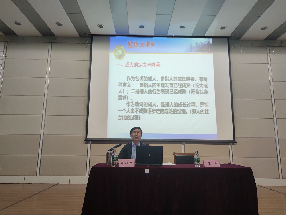 张建祥从成人的定义与内涵、目标与任务、途径与方法三个方面进行讲解。他指出,成人不仅意味着人的生理、行为表现已经成熟,还要承担社会赋予成年人的各项权利与义务。随着成人过程的推进,社会对人的要求及权利义务也会有所不同。当代大学生应明晰立德、强智、健体、尚美、勤劳与做人的关系;铭记习总书记的期望,实学实干,在攀登知识高峰中追求卓越;主动顺应社会要求,努力成为德、智、体、美、劳全面发展的社会主义合格建设者和接班人。