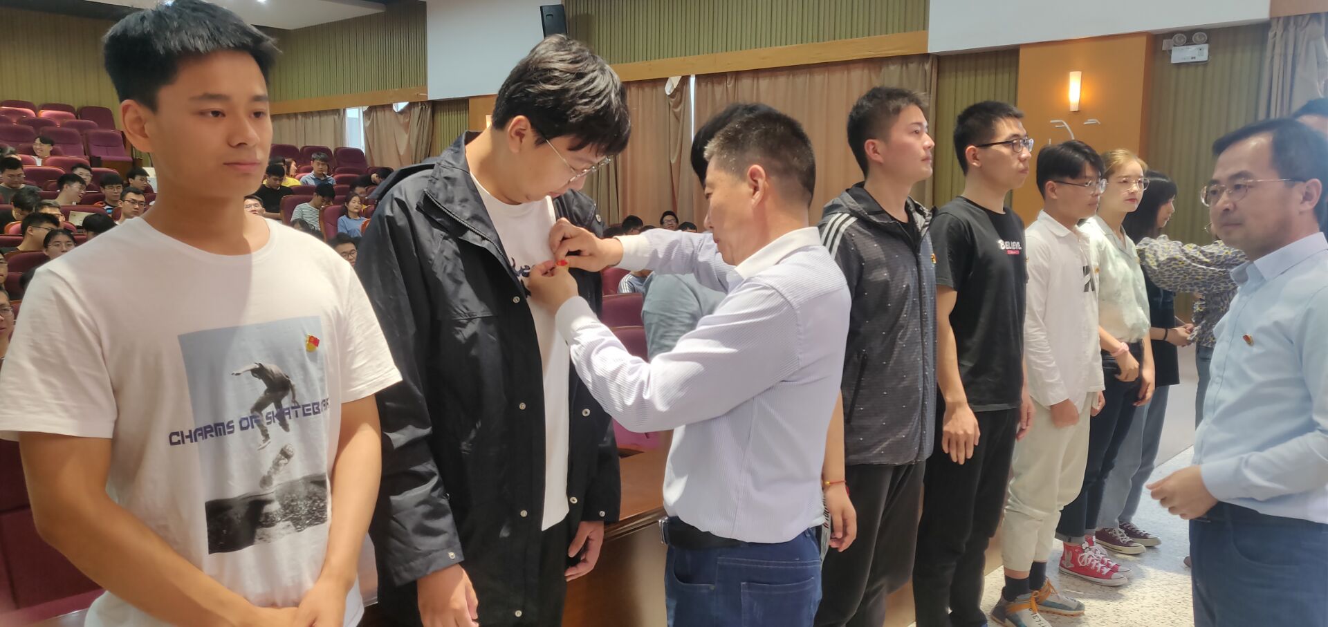 会上,秦卫兵介绍了学生党员队伍建设情况。学院党委负责同志和党支部书记为新党员代表配戴党徽。新党员本科生代表何乾坤、研究生代表徐苏柏作表态发言。