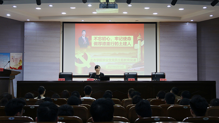 为扎实推进党史学习教育,加强毕业生党员教育,强化党员服务意识,6月10日下午,在南校区土木馆报告厅,土木学院党委书记顾志兰为2021届毕业生党员上《不忘初心、牢记使命,做厚德重行的土建人》专题党课。学院党委副书记谷伟、学工办教师及全体毕业生党员参加。