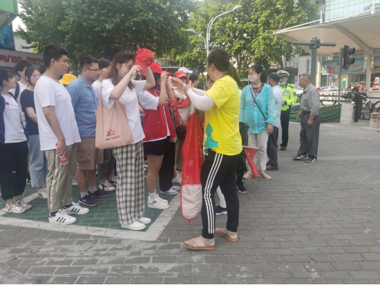 早上7点15分,师生在校区大门口集合,乘车前往约定好的人民路附近,见到了本次活动对接的孟庆祥警官。孟警官首先让学生穿上志愿服务的统一服装,他说:“大家穿上志愿服务的衣服后,就不再是一名学生了,而是一名交通指挥员。你们要去到各个路口执勤,肩负起这个重任!”接着,孟警官给大家讲解了在路口执勤的一些注意事项,以及如何挥动手中的旗子。孟警官将志愿者统一进行分配,让大家在各自的岗位上协助交警同志指挥行人和车辆,引导行人过成路时注意安全,也预防交通堵塞。