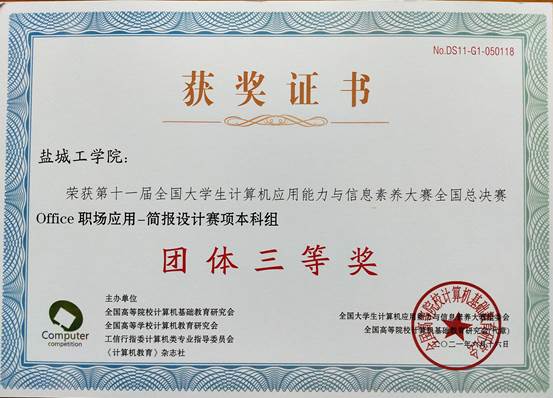近日,“第十一届全国大学生计算机应用能力与信息素养大赛”全国总决赛在线上进行。经过激烈角逐,在ICT计算机基础大赛项目中,贝博获团体三等奖,B物联网192班吴金龙、B机制196班张子茹2位同学获二等奖,D计算机193班左方慧等10人获三等奖,邵洪成等2位老师获二等奖指导教师称号,孙久等10位老师获三等奖指导老师称号。在BAP Office商务应用能力大赛项目中,bb贝博艾弗森官方网站获团体三等奖,D工管201班邹东旭获一等奖,B计算机191班张华等13人获三等奖,董琴等10位老师获三等奖指导老师称号,bb贝博艾弗森官方网站获得突出贡献奖。