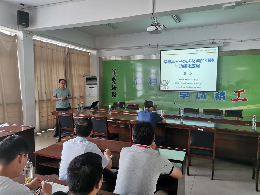 6月22日下午,扬州大学化学化工学院院长韩杰教授应邀来贝博作题为“导电高分子纳米材料的组装与功能化应用”的学术报告。报告会由化学化工学院院长奚新国教授主持,化工学院、材料学院相关教师和研究生参加。