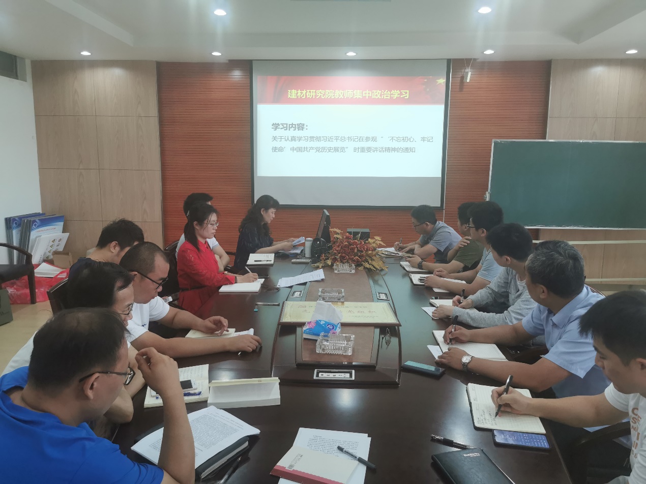 7月12日,在北校区知达楼AE209会议室,建材研究院第一党支部组织教师集中学习贯彻习近平总书记在参观“不忘初心、牢记使命”中国共产党历史展览时重要讲话精神和在中央政治局第三十一次集体学习时重要讲话精神。建材研究院党总支副书记邓育新领学,第一党支部全体教师党员参加。