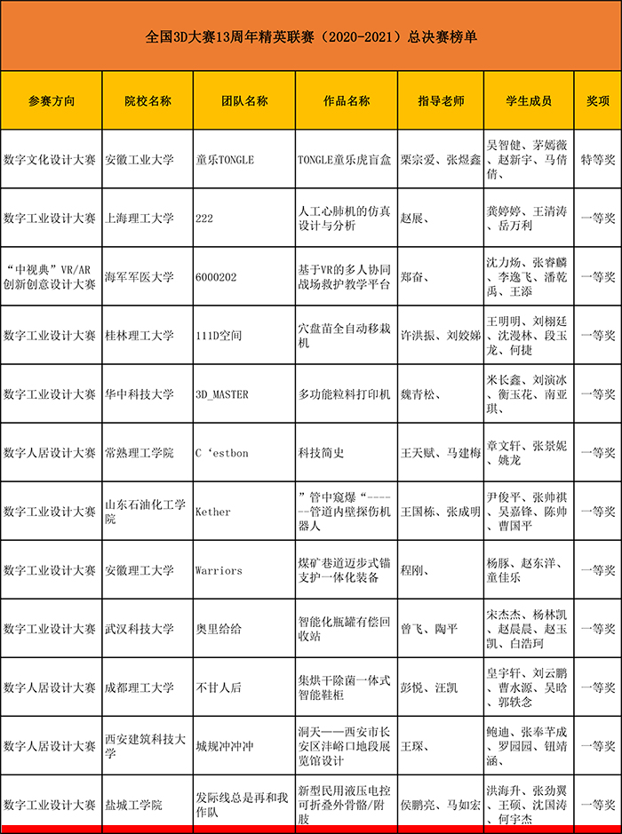全国3D大赛13周年精英联赛(2020-2021)自2020年9月25日启动以来,全国31个省/直辖市/自治区赛区,大学生组和研究生组共有389所高校,680个院系报名参赛,共提交了5556件初赛作品。2021年4月15日,精英联赛省赛作品提交截止,各赛区、各院校经初赛/校赛、网络海选等方式,共推荐报送省赛团队2953个,作品2953件。经过校赛、省赛层层选拔,贝博机械优集学院共提交12项作品,获得江苏赛区特等奖2项,一等奖1项,二等奖5项,三等奖2项。本次全国3D大赛13周年精英联赛(2020-2021)总决赛有近300个团队参与国赛角逐龙鼎大奖。