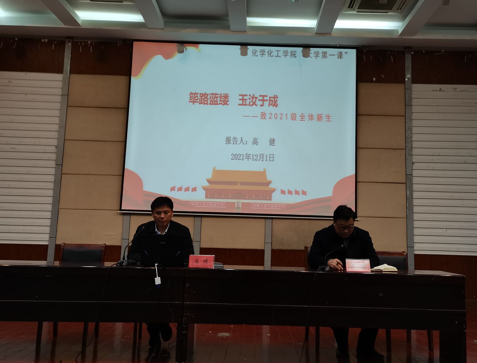 12月1日,在北校区五四报告厅,化学化工学院党委书记高健为新生作题为《筚路蓝缕,玉汝于成》专题讲座。学院党委副书记江滔主持,新生辅导员及全体新生近400人聆听了讲座。