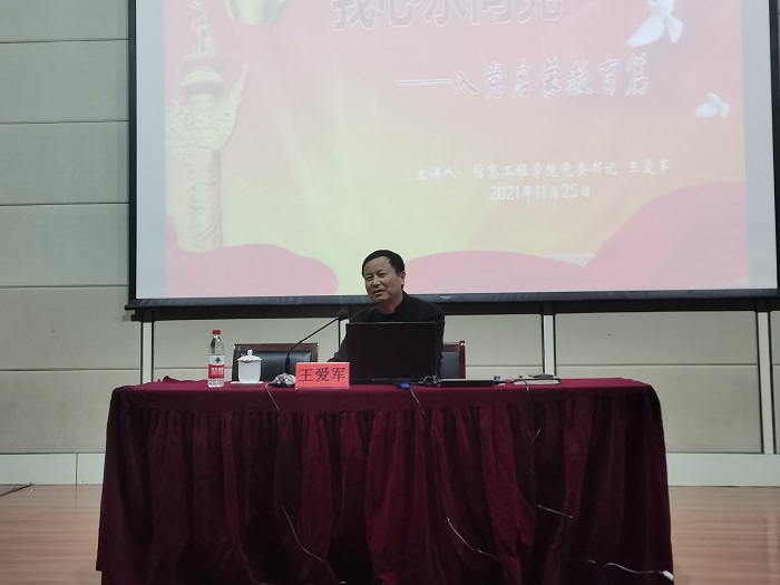王爱军作《我心永向党——入党启蒙教育》专题讲座,从中国共产党的性质和端正入党动机两大方面为新生作入党启蒙教育。他详细讲解了中国共产党的基本知识,强调了党对青年学生成长的关键作用,剖析了不良入党动机的表现,通过学习优秀党员的先进事迹来帮助新生加强对党的认识,端正入党动机。他强调,端正入党动机,是正确行动的精神力量,只有树立了正确的入党动机,才能经受住党组织的考验。他希望同学们以优秀党员为榜样,加强党的理论知识的学习,努力学好科学文化知识,提高自身素质,打牢为人民服务的基础,增强为人民服务的意识,以实际行动争取早日入党。