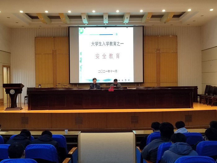 11月6日,土木工程学院在北校区化工楼报告厅举办2021级新生“大学第一课”之心理健康教育、安全教育专题讲座。心理健康教育中心主任、学生处副处长韦春华和校保卫处原处长仇立华主讲,土木工程学院党委副书记陈广正主持,新生辅导员及526名新生参加,其中B建筑211班新生在南校区A101教室通过线上腾讯视频会议同步观看。