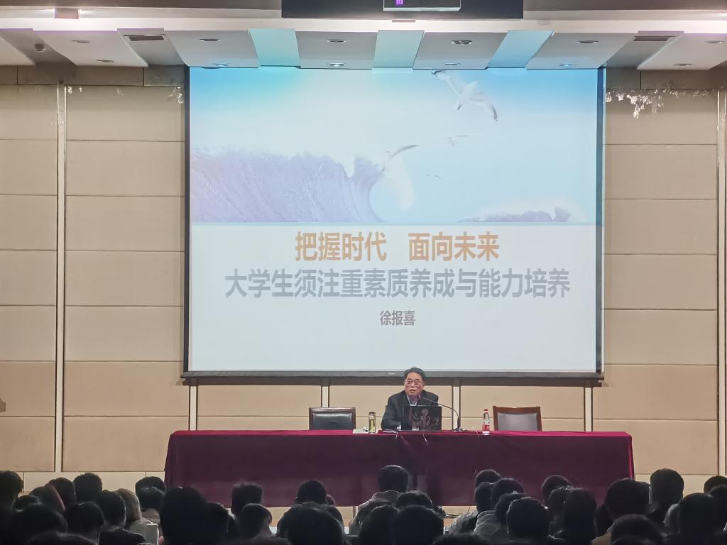 徐报喜作《把握时代 面向未来——大学生需注重素质养成与能力培养》专题讲座。他指出,素质是一个人稳定的个性特征和行为倾向,素质是通过一个人的思维和言行表现出来的。通过对思维道德素质、专业知识和智力素质、人文素质、心理与身体素质等方面的详细讲解,引导新生在积极向上的环境中克服懒惰、抵御诱惑,进而顺利完成学业,为实现人生目标提供发展动力和保障。他强调,素质与能力的养成与培养是循序渐进、不断提升的过程。作为新时代的青年学子,广大新生要不断提升自我素质和能力,努力成为一个德智体美劳全面发展的社会主义建设者和接班人,为实现中华民族伟大复兴贡献更多青春力量。