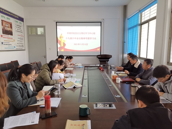 11月15日上午,在北校区环境学院会议室,环境学院党总支理论学习中心组集体学习研讨党的十九届六中全会精神。学院党总支书记陈阳主持,全体中心组成员参加。
