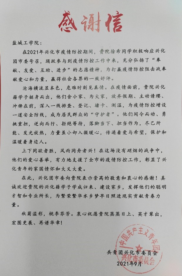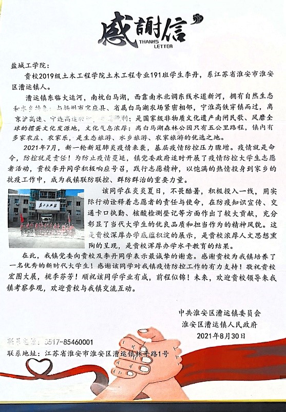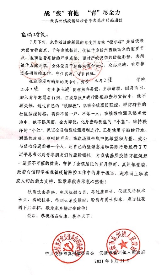 据不完全统计,2021年暑期,该校土木工程学院有百余名大学生志愿者放弃暑期休息时间,不畏艰难,积极参与到当地高速公路收费站、乡镇卫生院、街道、社区、村委会等疫情防控工作中,他们的先进事迹被江苏商报、长芦快讯等多家媒体报道。