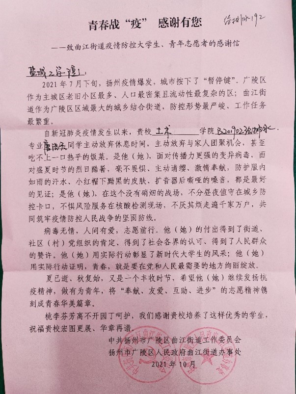 “疫情就是命令,防控就是责任。”近日,bb贝博艾弗森官方网站土木工程学院党委陆续收到全省各地区、街道和部门寄来感谢信,感谢大学生志愿者在疫情爆发的风险地区,充分弘扬“奉献、友爱、互助、进步”的志愿精神,主动放弃暑期休息时间,放弃与家人团聚机会,面对盛夏烈日,为疫情防控增设一道安全防线,成为居民群众的“守护者”。