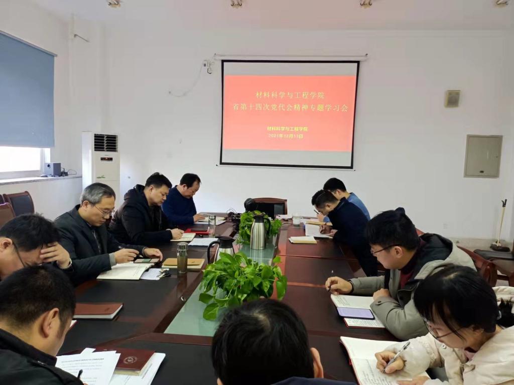 12月13日上午,材料学院召开党委理论学习中心组会议,集中学习江苏省第十四次党代会精神。会议由院党委书记唐浩主持,中心组全体成员、各支部书记参加学习。