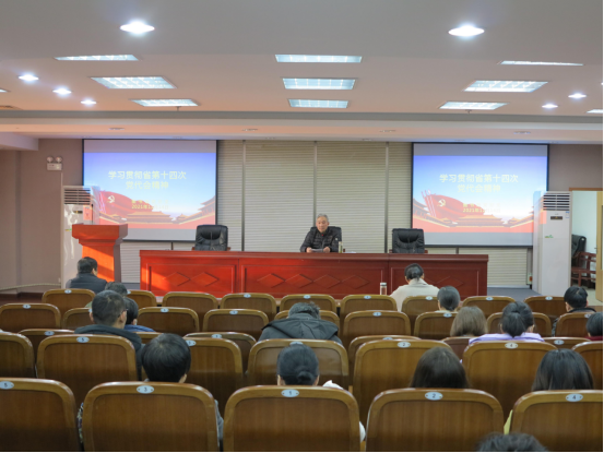 12月14日下午,在图书馆五楼报告厅,图书馆组织全体教职工学习贯彻省第十四次党代会精神。党总支书记花爱军主持。