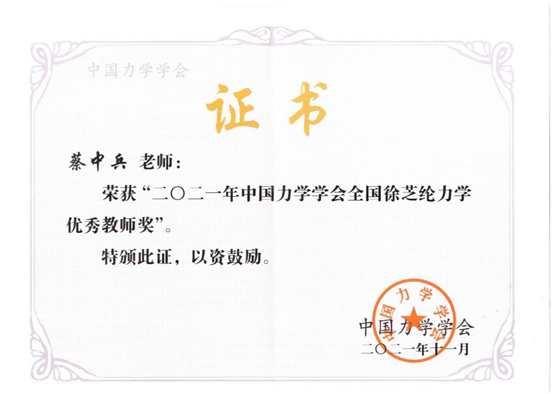 近日,中国力学学会教育工作委员会公布了“2021年中国力学学会全国徐芝纶力学优秀教师奖”名单,贝博土木学院蔡中兵老师获此殊荣。全国共有88名教师获奖,江苏省共8名,蔡中兵老师是此次省内获奖的唯一一位学院层级的教师。目前贝博已有佘斌、孔海陵、王路珍、蔡中兵4位力学老师获此殊荣,这代表着贝博力学教师整体的教书育人水平得到了国内同行的一致认可。