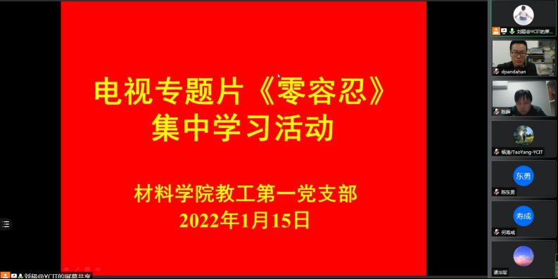 1月15日晚,材料学院教工第一党支部以腾讯会议的形式,开展了电视专题片《零容忍》第一集《不负十四亿》集中学习活动,材料学院教工第一党支部20余名教工党员参加,活动由支部书记刘超主持,支部委员韩朋德、陈晖组织参加。
