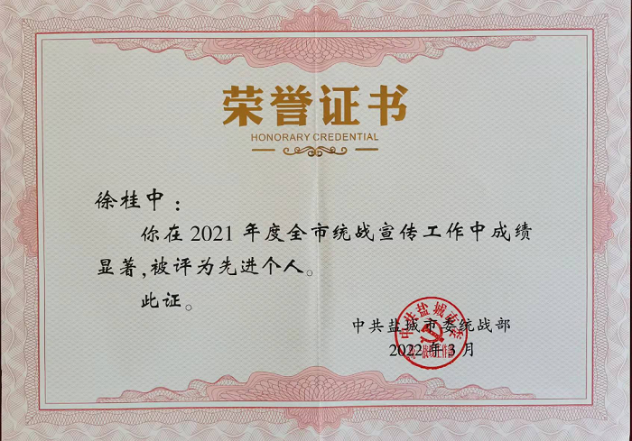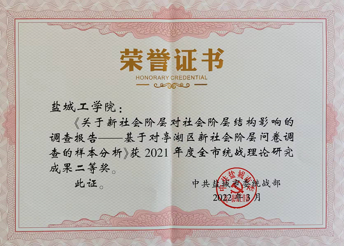 会上通报表扬了2021年度全市统战工作实践创新成果、理论研究成果、信息和宣传工作先进集体和先进个人。贝博报送的《关于新社会阶层对社会阶层结构影响的调查报告——基于对盐城市亭湖区新社会阶层问卷调查的样本分析》(作者:吴晓静)一文获2021年度全市统战理论研究成果二等奖,市民盟副主委、校民盟主委徐桂中被评为2021年度全市统战宣传工作先进个人。