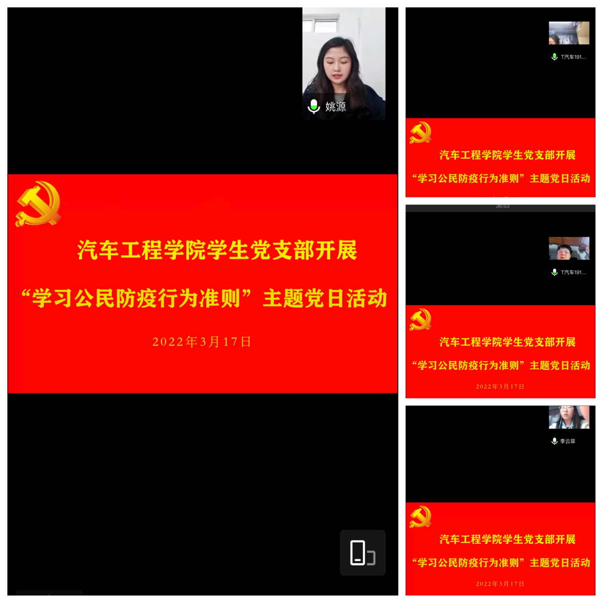 为了加强同学们对防疫知识的学习,了解学校的工作部署,落实防疫行动,汽车工程学院学生党支部组织开展“学习公民防疫行为准则”主题党日活动,践行党员在防疫工作中的初心和使命,引导督促班级同学遵守防疫规定,发挥学生党员的先锋模范作用。