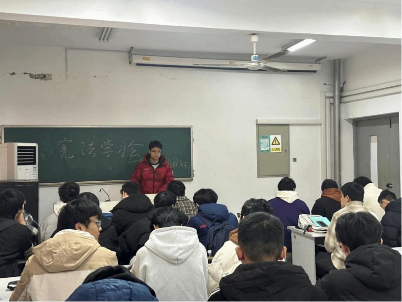 12月4日晚上,2024级新生分别在学院会议室、知行楼教室组织开展主题班会。全体新生观看了“宪法的精神 法治的力量——2024年度法治人物”专题节目,并围绕宪法历程、宪法地位、新时代修宪等内容进行宣讲,进一步增强学生的法律意识和责任感。