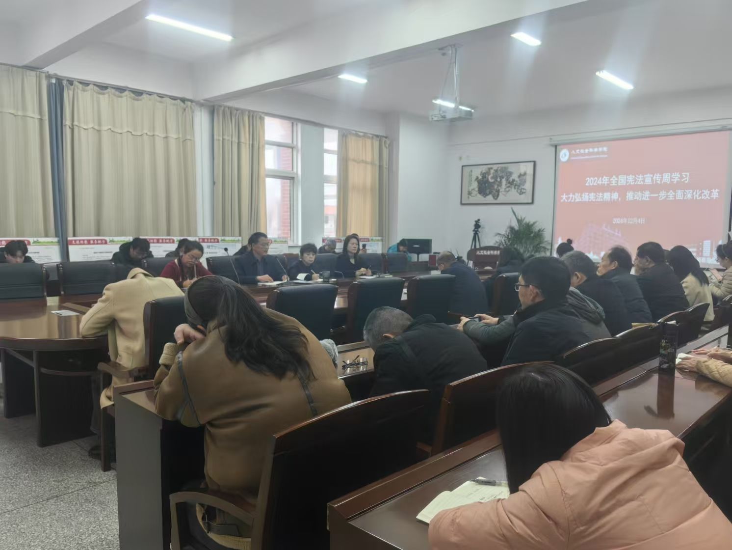 12月4日下午,人文学院在仁和楼A304会议室召开2024年全国宪法宣传周专题学习会。会议由学院党总支副书记姚爱华主持,学院教职工参加会议。