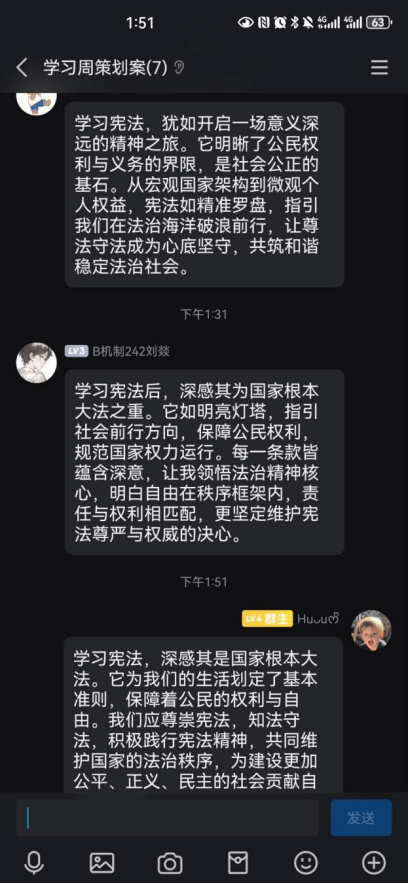材料学院持续推进“宪法卫士”行动计划,在今年的全国学生“学宪法讲宪法”活动中,全院1954名学生,答题通过率达100%,通过网络学习切实增强全员法治观念,逐步形成全员尊法学法守法用法的浓厚氛围。同时,学院利用“盐工真材实料”微信公众号平台,推送宪法宣传相关内容,扩大了宪法宣传的影响力,让宪法精神深入人心。