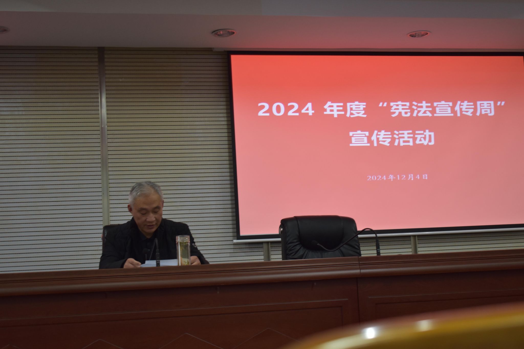 为全面学习贯彻党的二十大和二十届三中全会精神,深入学习贯彻习近平法治思想,弘扬宪法精神,12月4日下午,在希望大道校区图书馆五楼报告厅,图书馆组织开展以“大力弘扬宪法精神,推动进一步全面深化改革”为主题的“宪法宣传周”学习教育活动,党总支书记花爱军主持,全体教职工参加。