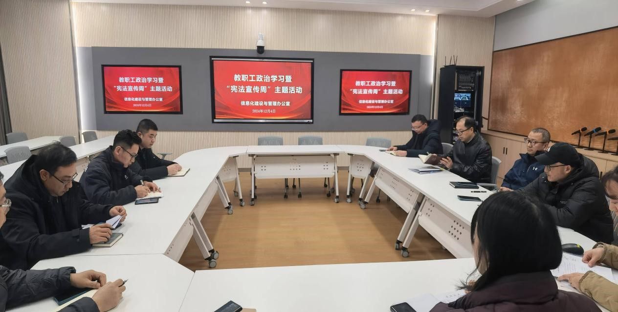为全面贯彻落实党的二十大和二十届三中全会精神,深化习近平法治思想的学习与实践,弘扬宪法精神,传播宪法理念,信息化建设与管理办公室在12月4日即第十一个国家宪法日来临之际,在博学楼D309会议室开展“宪法宣传周”活动。信息化办主任王益群主持学习活动,部门全体教职工参加。