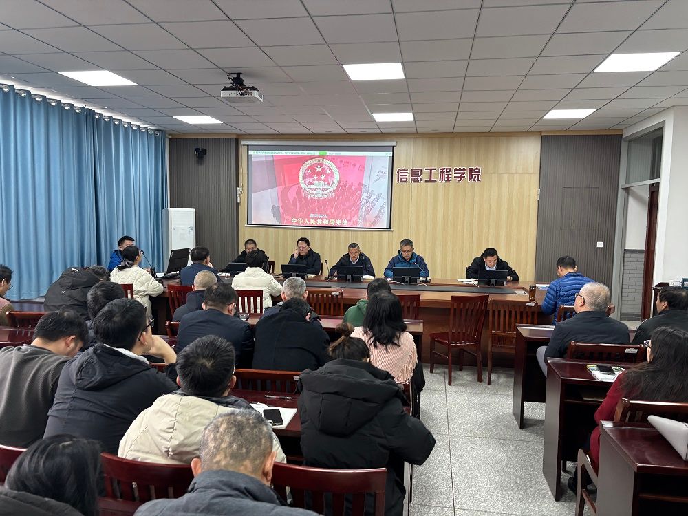 12月4日下午,信息工程学院在怀德楼B410会议室开展宪法宣传学习活动。学院党委书记杨军领学《中华人民共和国宪法》,指出宪法是国家的根本大法,是治国安邦的总章程,适用于国家全体公民,是特定社会政治经济和思想文化条件综合作用的产物,集中反映各种政治力量的实际对比关系,确认革命胜利成果和现实的民主政治,规定国家的根本任务和根本制度,即社会制度、国家制度的原则和国家政权的组织以及公民的基本权利义务等内容。