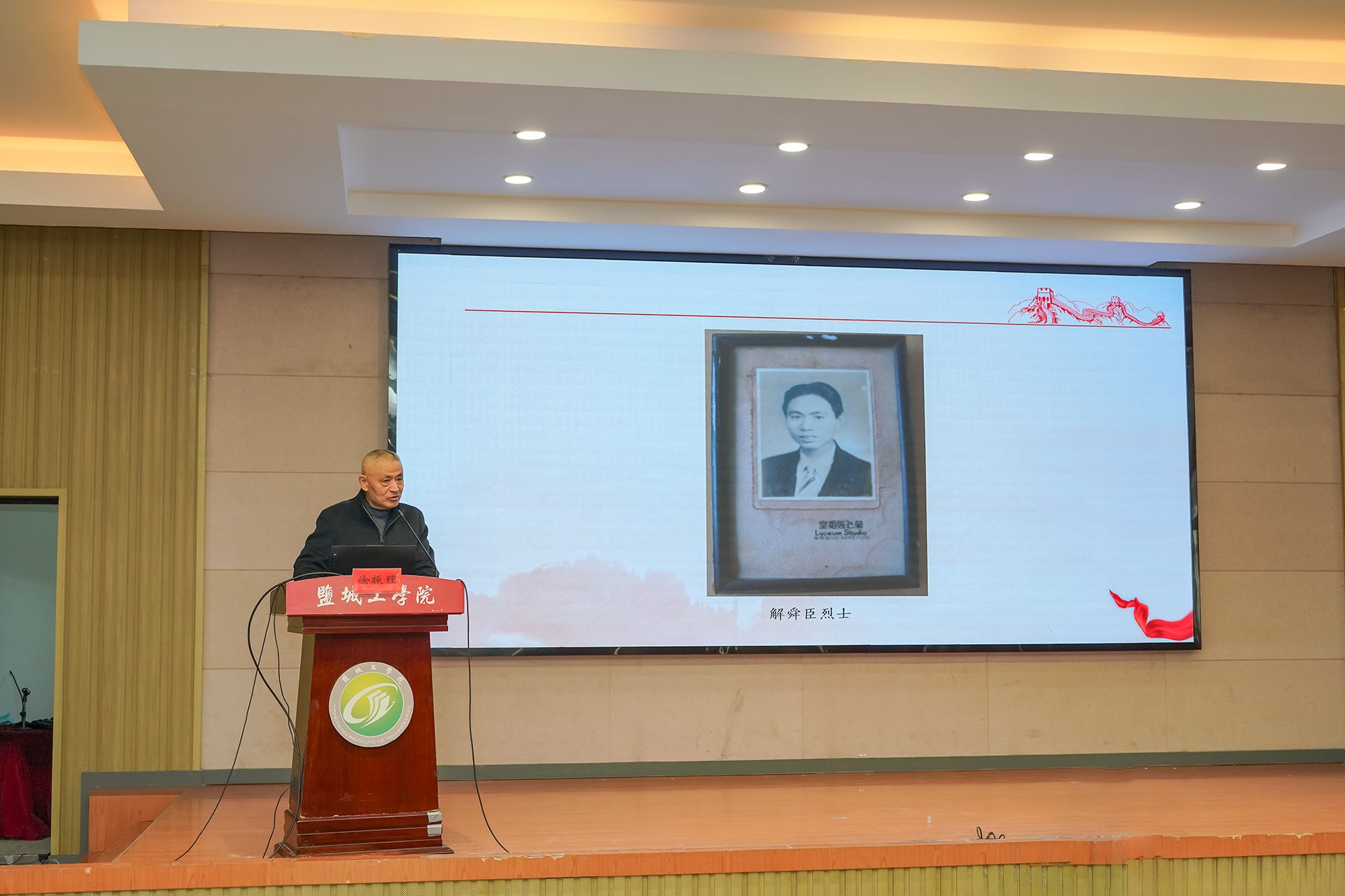 随后,滨海县人民法院政治部科员亓佳慧以“卷宗里的英烈故事——解舜臣”为题,围绕“铁骑破晓惊残梦、大厦将倾撑断梁、烽火狼烟映忠骨、朝阳初升续霞光”四个方面,作了专题讲座。她详细阐述了解舜臣烈士在滨海县东坎镇的英勇事迹,并激励广大青年要赓续红色基因,不负韶华,追求卓越。滨海县新四军研究会会长徐振理则以“情系解舜臣烈士”为题,通过一个个简单质朴却直击心灵的小故事,生动展现了解舜臣烈士的英勇形象,深刻揭示了那个动荡年代滨海人民与新四军将士共同经历的生死考验和结下的“鱼水深情”。